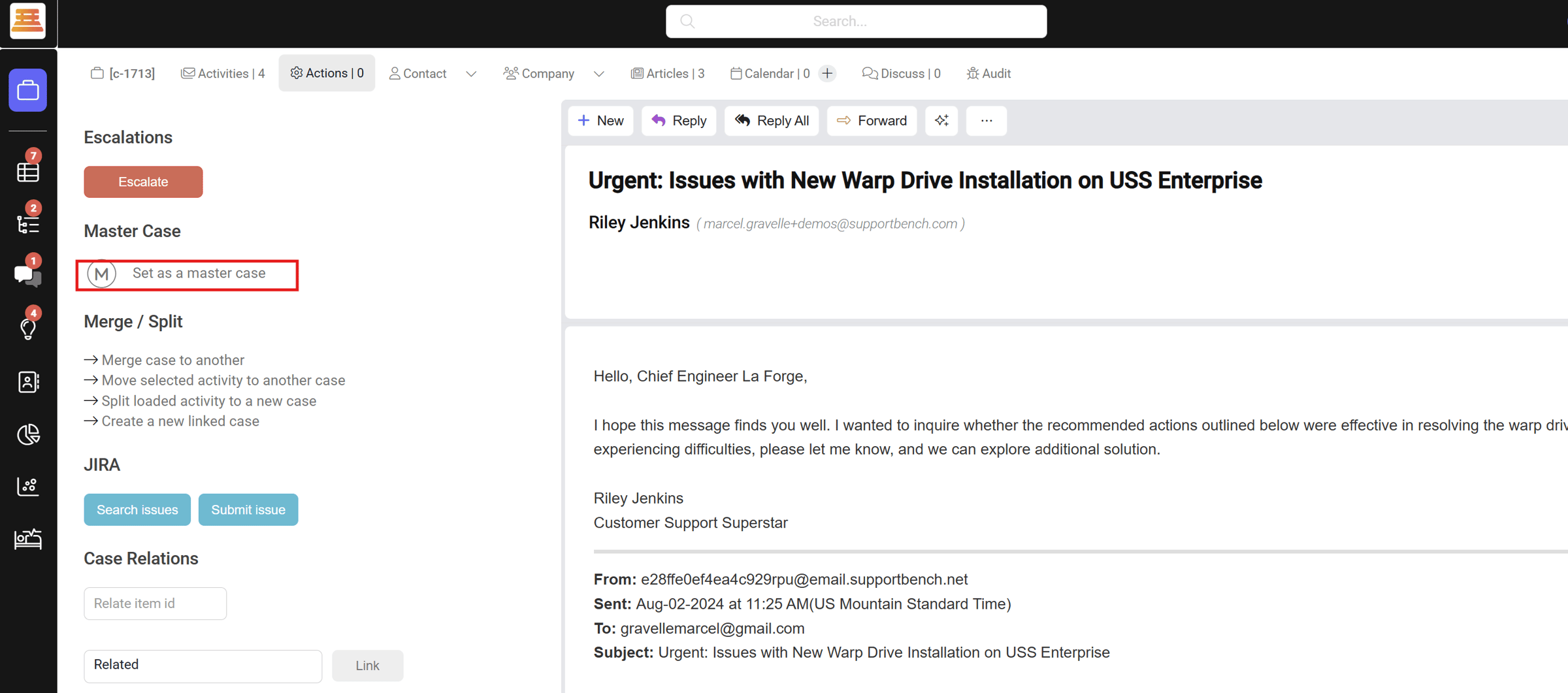 Master cases enable streamlined ticket management by allowing you to designate a case as the "master case." Key features include: